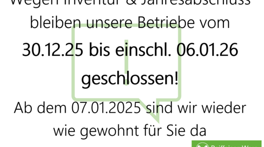 Wegen Inventur und Jahresabschluss sind unsere Betriebe vom 30.12.25 bis 06.01.2026 geschlossen.